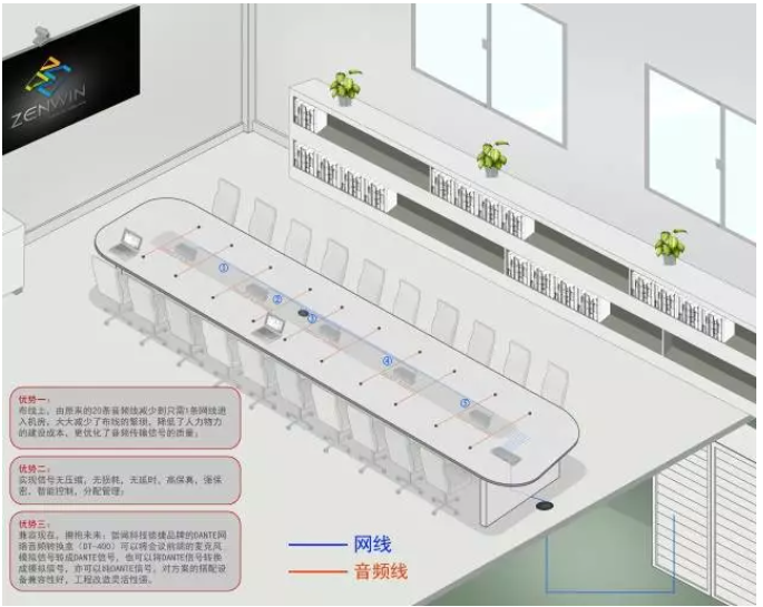 特別是在軍事機密之地,嚴肅、謹慎、高度戒備,在其會議室設備選擇上,除了要考慮到以上問題,還要求性能穩定,高效快捷,保密性強。經過多次篩選,軍區選用了DANTE智慧會議分布式解決方案:音頻部分用了CLOCKAUDIO的界面麥克風、名舞臺科技德捷品牌的DANTE網絡音頻轉換盒(DT-400 )、8路數字自動混音器、思美處理器、銳豐百靈達音箱,視頻部分用了哲聞科技柏邇品牌的網絡傳輸器(TP-402P HDBast),音視頻相結合,共同搭建了一個安全、高效、兼容傳統與DANTE、易于擴展的新型會議系統。