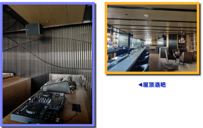 27樓屋頂酒吧Flair,分室內(nèi)室外兩部分,配置DJ打碟機,主擴聲由EV SM系列全頻同軸+15寸超低音組成,室外視野極佳,就坐于池水邊。身邊綠植叢中隱藏的EV 8寸蘑菇音箱同步播放室內(nèi)音樂,品美酒賞夜景甚為愜意,開業(yè)即成為高新區(qū)的一個新的網(wǎng)紅打卡地。
