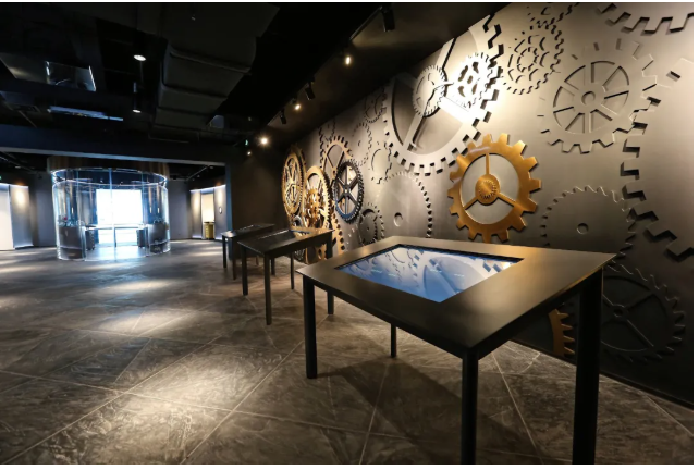 二層為鐘表文化體驗展廳,該展廳由五個部分組成:臨展區:預留投影面、展柜位等空間,滿足臨時主題展覽靈動可變的展示需求。多媒體互動區:通過聲光電一體化的多媒體系統介紹腕表的歷史與設計演變。手表材料與機芯展示區:通過空間沉浸式造景設計對手表機芯及手表不同結構材料進行展示。機械互動體驗區:通過空間造景和多媒體展示,打造虛實結合的體驗場景來介紹手表機械裝置和工藝。手作體驗區:手表拼裝體驗。