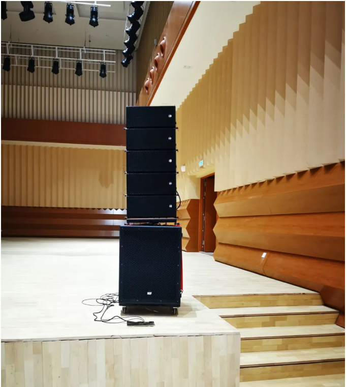 琴島”音樂廳音響系統(tǒng)采自意大利進(jìn)口品牌RCF音響,HDL有源線陣列系統(tǒng),舞臺返聽為兩組ART300有源系列音箱。