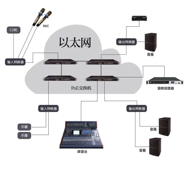 Dante技術(shù)可以在以太網(wǎng)(100M或者1000M)上傳送高精度時鐘信號以及專業(yè)音頻信號并可以進行復(fù)雜的路由。可以任由音頻信號在以太網(wǎng)中使用TCP/IP方式任意傳送,而且在這個過程中保持了信號的精確還原。下圖直觀反應(yīng)了DANTE網(wǎng)絡(luò)的連接工作方式: