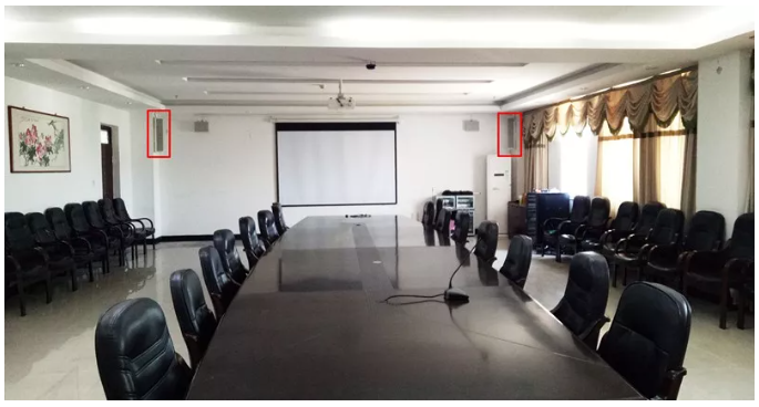 在各類會議室中,圓桌會議室占了很大一部分,通常情況下,這種會議室采用主音箱支架擺放的形式或者是采用吸頂音箱均勻布置在會場上空的方式。這兩種方式各有優(yōu)缺點,采用主擴聲的方式,難以達到很好的聲場均勻度,系統(tǒng)容易出現(xiàn)嘯叫,系統(tǒng)調(diào)試困難;而采用吸頂音箱的方式雖然解決了聲場均勻度的問題,但從會議室的整體來看,由于有投影的存在,存在聲像定位問題。