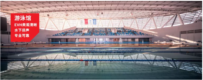 游泳館除了設有標準競賽游泳池、訓練池外,還設有各種水療休閑設施、部分水上用品商業(yè)以及兒童娛樂池和滑道等,供普通市民休閑娛樂使用。在游泳館頂部,業(yè)主同樣選用了白色EVH系列揚聲器,在美觀度和品質方面和場館高度統(tǒng)一。