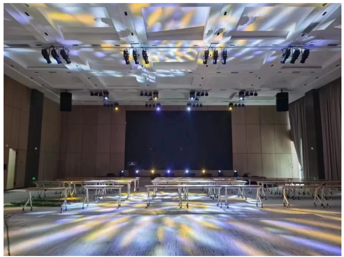 燈光系統(tǒng)選用DLW筑夢燈光 DLW 400 BSW三合一電腦燈、DLW 354C4 PAR LED染色燈、DREAM 200PL IMAG定焦成像燈、DREAM 200 WSL LED成像燈,并與音響系統(tǒng)聯(lián)動,共同打造集聲光電為一體的多功能宴會廳。
