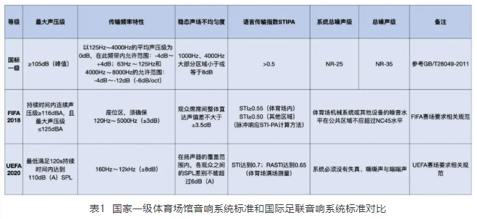 (2)其次,需要與時俱進,筆者建議國標增加對高等級、高投資體育場館的擴聲系統指標建議,并適當向國際標準看齊。以大型體育場/足球場擴聲系統為例,對比中國國家一級標準、歐足聯標準和國際足聯標準可以發現,目前中國國標已與現有其他世界標準形成了一定的差距,具體如表1所示。當然,國家標準的調整還需要根據整體國情、行業具體發展情況等因素進行綜合平衡考量。