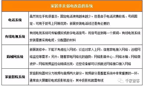 高檔別墅等的裝修可能帶有監控系統、智能安防系統等。而普通人家的弱電裝修一般就涉及電話、電視、局域網以及家庭影院這四大系統。