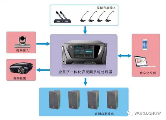 輸出端可以獨立完成對輸出端音頻的整理,包括音箱的標(biāo)準(zhǔn)化和聲學(xué)環(huán)境的補償處理、視頻終端的多窗口拼接處理、傳輸補償和控制系統(tǒng)的多種格式的控制信號的輸出等等。