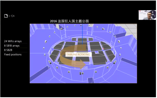 這個智能化的追蹤平臺叫做Black Trax,是一個基于視覺來追蹤的追蹤系統,它可以在復雜的環境中實時的追蹤表演者,或任何帶有Black Trax信標器的任何目標,還能發送定位信息到調光臺,媒體服務器或其他的第三方系統,實現各個部門的聯通。2016年的法國狂人主題公園也運用到了這個技術,整個舞美的布局十分巧妙,觀眾席中間圍繞著軸旋轉,音響則是圍著周邊布置一圈,共有24組。在整個的場地和觀眾座位的旋轉以及演員行走的同時,聲音還是保持了定位。