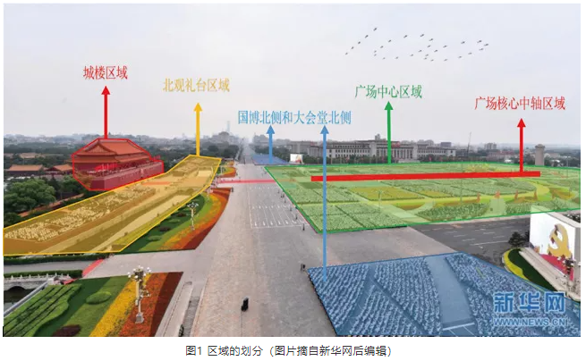 廣場區域主要包括北臨長安街中線位于獻詞團兩側的觀眾席,南至紀念碑,西至廣場西側路,東至廣場東側路。這個區域也是觀眾數量最多、最集中的地區。