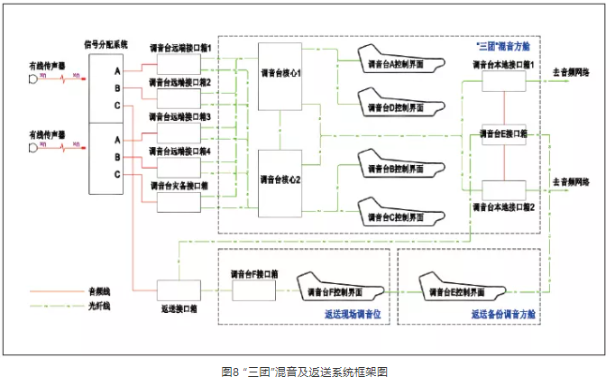 聯合軍樂團、合唱團、獻詞團分別由1 314人、2 974人、1 068人組成,大會期間承擔前期合唱熱場以及青少年致獻詞的環節。“三團”混音及返送系統設置了近200個通道的傳聲器拾音,利用傳聲器分配系統直接送入在“三團”附近的調音臺網絡,并實現分區域返送,如圖8所示。現場和混音方艙內的調音臺系統之間通過光纖以雙星型網絡連接,所有信號從拾音、傳輸到混音都實現了主備冗余。
