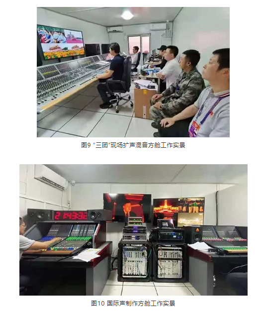由于音響系統的各工作點位相對分散,且功能需求不同,除了幾個相對固定的機房,本次活動中還臨時搭建了幾個工作“方艙”,如國際聲制作混音方艙、“三團”混音制作方艙及在廣場觀眾席后方搭建的現場混音方艙等。